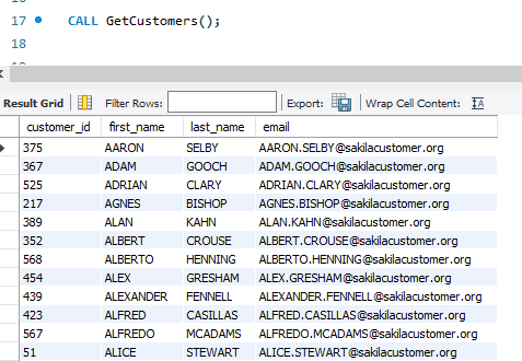| DELIMITER $$ CREATE PROCEDURE GetCustomers() BEGIN SELECT customer_id, first_name, last_name, FROM customer ORDER BY first_name; END$$ DELIMITER ; |