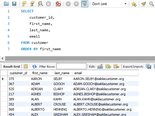 | SELECT customer_id, first_name, last_name, FROM customer ORDER BY first_name; |